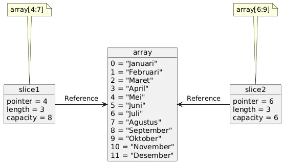 package mainimport "fmt"type Address struct { City, Province, Country string}func main() { var address1 Address = Address{"Pekanbaru", "Riau", "Indonesia"} var address2 *Address = &address1 // Atau // address1 := Address{"Pekanbaru", "Riau", "Indonesia"} // address2 := &address1 address2.City = "Bandung" fmt.Println(address1) // ikut berubah fmt.Println(address2) // berubah menjadi Bandung