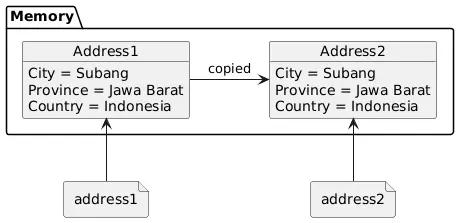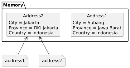 tapi address1masih ikut berubah karena coding address2.City = "Bandung" masih mengarah ke reference address1